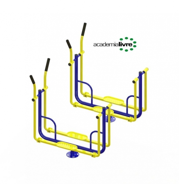 Aparelho fabricado em aço carbono, estrutura principal com tubo redondo 2.1/2” x 2 mm. E secundária com tubos redondos de 2” x 2,65 mm, 1”.1/2” x 2 mm, 1”.1/4” x 2 mm, 1” x 2 mm, retangular de 30 x 50 x 2 mm, chapa calandrada em formato “U” 40 x 25 mm por 1/4”, reforço triangular 50 x 75 mm, dois pisantes vazados com bordas arredondadas e sem quinas com 140 x 320 x 2 mm, tampa externa 2"de plástico injetado, quatro cubos torneados de 2" x 2mm e quatro com 1”.1/2” x 2 mm, dois eixos de barra redonda trefilada 19,05 x 420 mm rosqueadas com porcas fixadoras travantes, quatro rolamentos duplos de 20 x 42mm na parte superior e quatro rolamentos duplos de 12 x 32mm fixadas com parafusos e porcas galvanizadas, manoplas de borracha 1.1/4” x 200mm, flange para fixação com 200 x 1/4’ com 4 furos ovalizados 30x20mm para quatro parabolds galvanizados 5/8” x 3”. Processo de Soldagem Mig e Pintura a pó eletrostática precedida de banhos químicos. Adesivo com material anti-vandalismo indicando os músculos trabalhados. Placa de alumínio com marca, mês/ano e demais informação do fabricante.