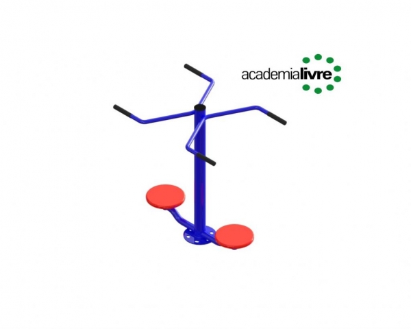 Aparelho fabricado em aço carbono, estrutura principal com tubo redondo 3.1/2” x 3 mm. E secundária com tubos redondos de 2” x 2,65 mm, 1.1/4” x 2 mm, dois discos Com borda arredondadas de 300 x 3mm, quatro manoplas de borracha 1.1/4” x 150mm, uma tampa externa 3.1/2” de plástico injetado, dois cubos torneados de 2" x 2mm, fixadas com parafusos e porcas galvanizadas 80mm, flange para fixação com 250 x 4 mm com 4 furos ovalizados 30x20mm para quatro parabolds galvanizados 5/8” x 3”. Processo de Soldagem Mig e Pintura a pó eletrostática precedida de banhos químicos. Adesivo com material antivandalismo, indicando os músculos trabalhados. Placa de alumínio com marca e demais informação do fabricante.
