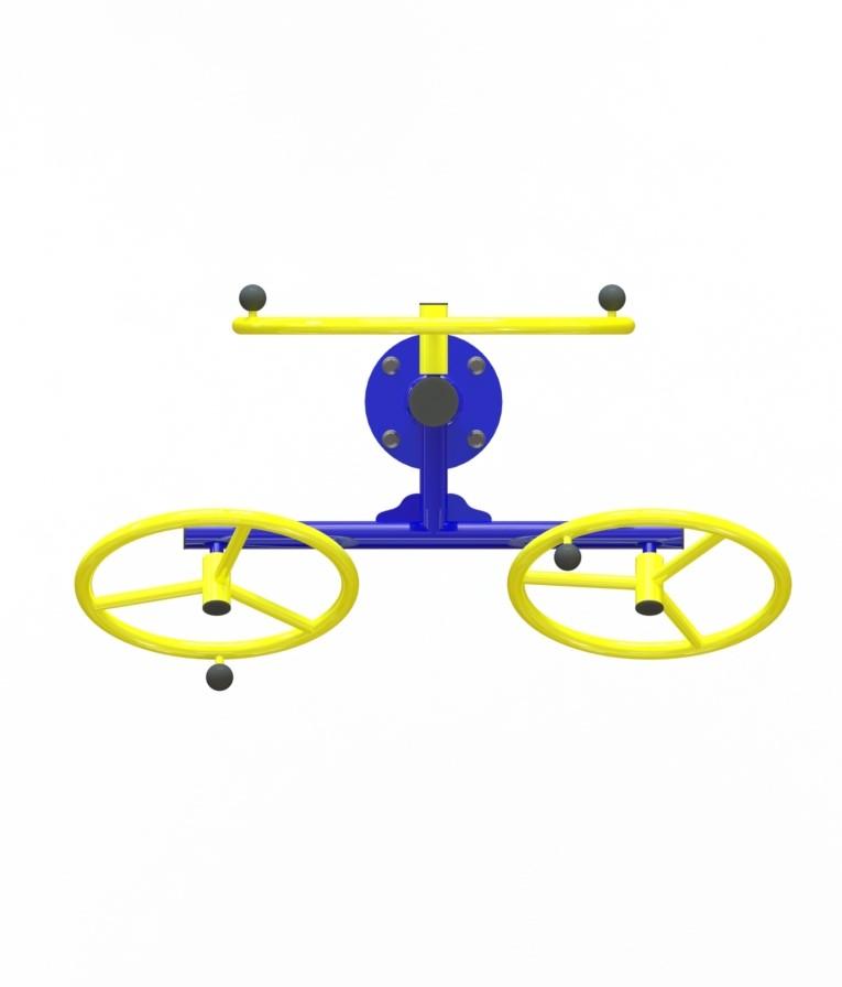 Aparelho fabricado em aço carbono, estrutura principal com tubo redondo 3.1/2” x 2 mm. E secundária com tubos redondos 1”.1/4” x 2 mm, 1” x 2 mm, tampa externa 2" e duas tampa de 2” de plástico injetado, três cubos torneados de 2" x 2mm, dois eixos de barra redonda trefilada 20 x 160 mm e um eixo de barra redonda trefilada 20 x 175 mm rosqueadas com porcas fixadoras travantes, três rolamentos duplos de 20 x 42mm fixadas com parafusos e porcas galvanizadas, esferas de nylon preto com Ø 50mm, dois volantes circulares com Ø 500mm, e um volante Ø 700mm, flange para fixação com 200 x 1/4’ com 4 furos ovalizados 30x20mm para quatro parabolds galvanizados 5/8” x 3”. Processo de Soldagem Mig e Pintura a pó eletrostática precedida de banhos químicos. Adesivo com material antivandalismo indicando os músculos trabalhados. Placa de alumínio com marca e demais informação do fabricante.