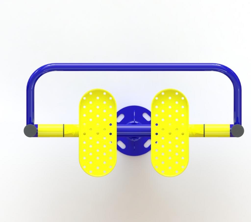 Aparelho fabricado em aço carbono, estrutura principal com tubo redondo 2.1/2” x 2 mm. E secundária com tubos redondos de 2” x 2,65 mm, , 1”.1/4” x 2 mm, reforço triangular 50 x 75 x 3mm, dois pisantes vazados com bordas arredondadas e sem quinas com 140 x 320 x 2 mm, tampa externa 2"de plástico injetado, quatro cubos torneados de 2" x 2mm, dois eixos de barra redonda trefilada 19,05 x 200 mm rosqueadas com porcas fixadoras travantes, quatro rolamentos duplos de 20 x 42mm na parte superior, flange para fixação com 200 x 1/4’ com 4 furos ovalizados 30x20mm para quatro parabolds galvanizados 5/8” x 3”. Processo de Soldagem Mig e Pintura a pó eletrostática precedida de banhos químicos. Adesivo com material antivandalismo, indicando os músculos trabalhados. Placa de alumínio com marca e demais informação do fabricante.